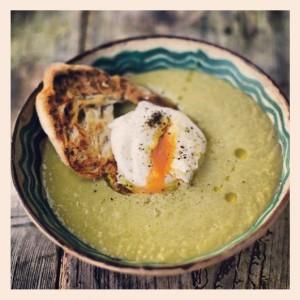 Just before I’m ready to serve the soup, I get a wide casserole-type pan on the heat with 8 to 10cm of boiling water. Using really fresh eggs, I very quickly crack all 10 into the water. Don’t worry about poaching so many at the same time. They don’t have to look perfect. A couple of minutes and they’ll be done, as you want them to be a bit runny. Toast your ciabatta slices. Using a slotted spoon, remove all the poached eggs to a plate and add a knob of butter to them. To serve, divide the soup between eight warmed bowls and place a piece of toast into each. Put a poached egg on top, cut into it to make it runny, season and drizzle with extra virgin olive oil.